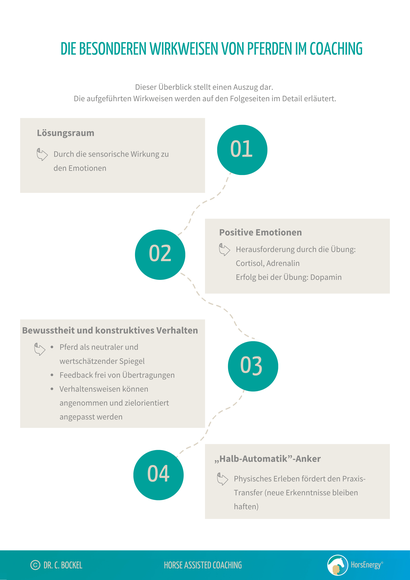 pferdegestützten Coaches bewirkt, dass die eigenen förderlichen Verhaltensweisen erkannt und für die Zukunft als wertvolle Handlungsoptionen verankert werden. Auf wertschätzende und manchmal auch
