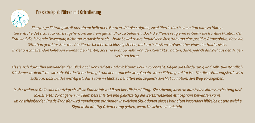 belastenden Situationen hin zu erleichternden Lösungsräumen. Dadurch wird Führung mit Pferden zu einer erlebbaren Erfahrung von Wirksamkeit