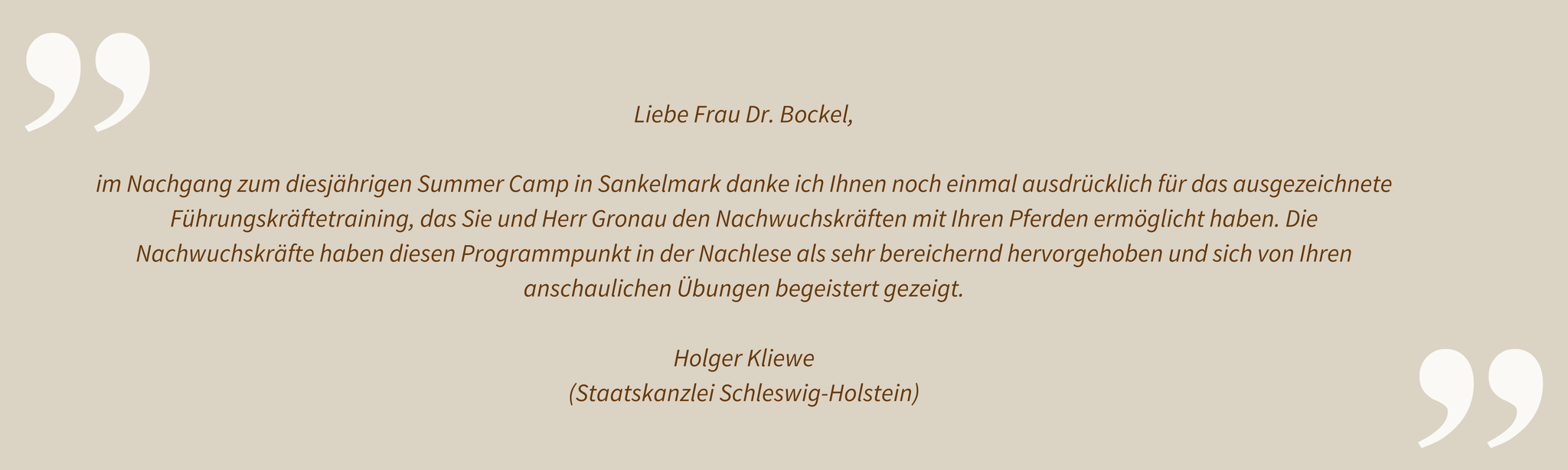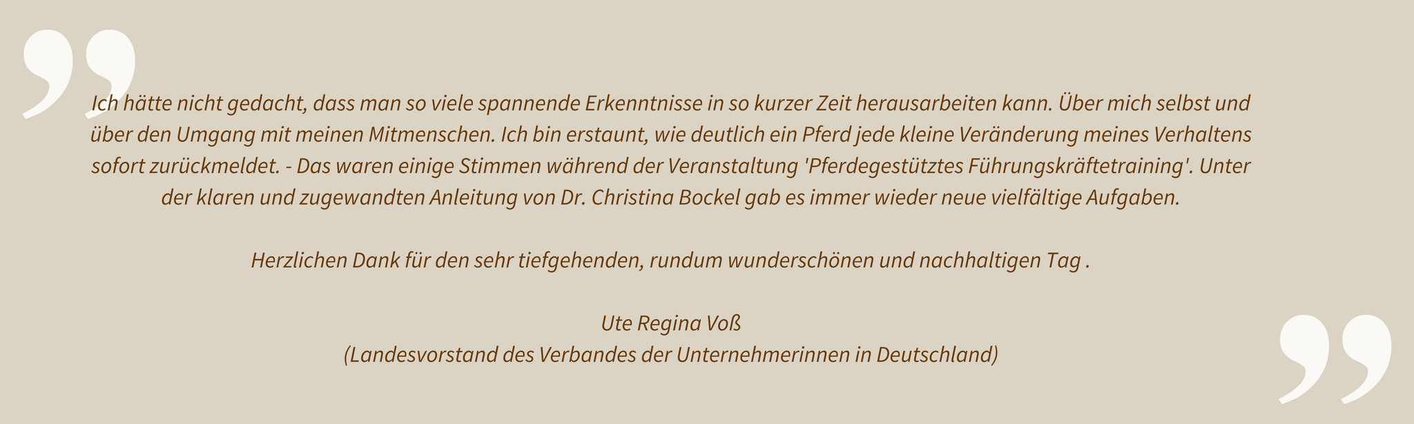 Gern unterstützen wir Sie auch dann in ihrer beruflichen und persönlichen Entwicklung, wenn Sie den Einsatz von Coaching-Pferden nicht wünschen. Mehr über das umfassende Angebot von Dr. Christina Bockel im Bereich „Führungskräfteentwicklung, Beratung & Coaching“ erfahren Sie auf der Website https://www.dcb-beratung.de/.